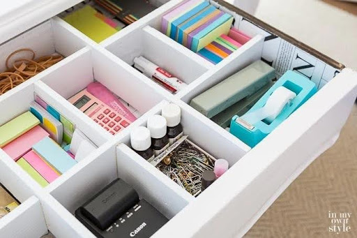 The next step brings order to chaos. Drawer dividers keep small items from mixing together. Clear storage boxes let you spot what you need right away, though labeled solid containers work just as well.